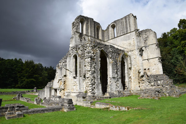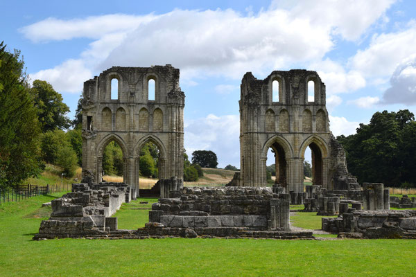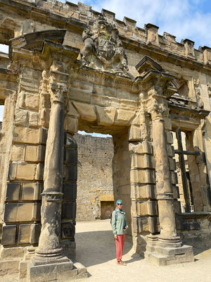 Wir bleiben im ländlichen Süden von Yorkshire und besuchen am Vormittag die Ruinen von Roche Abbey. Die enge Zufahrt über eine löchrige Piste und unter tief hängenden Ästen veranlasst mich reflexartig zu ein paar tiefsinnigen Aussprüchen: "Auuu", "Uuuhhh", "Na geh" oder "Geh leck" kommentiere ich äußerst treffend die Misere. Die Ruinen liegen dafür umso malerischer in einem grünen Tal, das von einem Bach durchzogen wird. Von den Ruinen der Abtei aus dem 12. Jahrhundert ist noch genug übrig, um mit wenig Fantasie sich ein Bild auszumalen, wie es ausgesehen haben muss. Man darf sich hier frei bewegen, alles angreifen und genau inspizieren. Genau das tun wir auch, bis sich unverhofft der nächste Regenguss über uns erleichtert. Wir nehmen das Wetter zur Kenntnis und fahren weiter nach Derbyshire, wo mit der Hardwick Hall unser zweiter Stopp geplant ist.