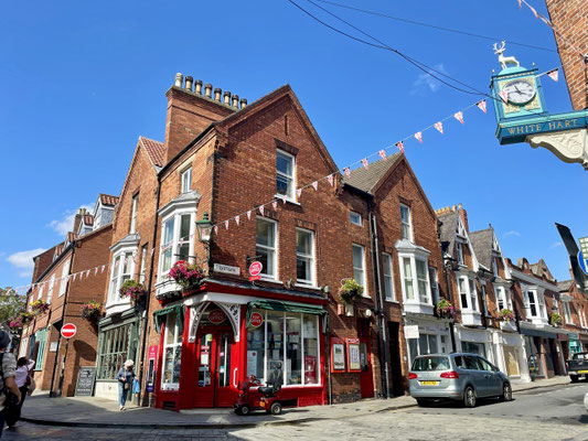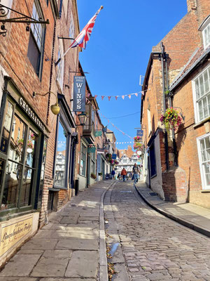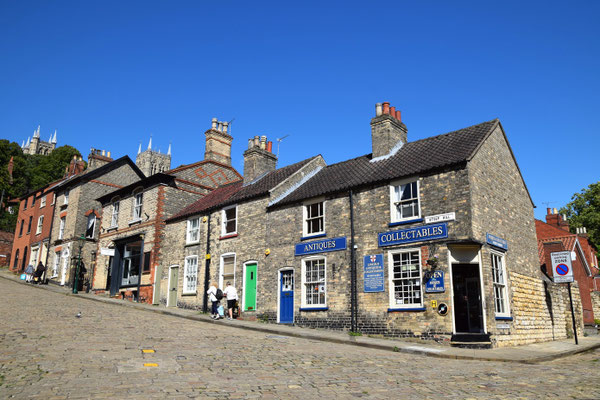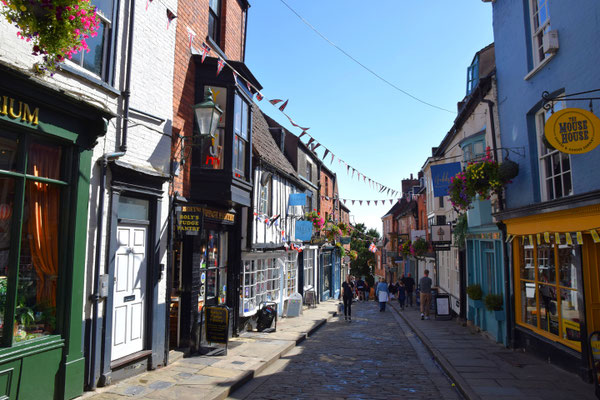 Während uns Ines zu einem Parkplatz am Stadtrand navigiert, erwischt uns ein apokalyptischer Regenguss. Innerhalb weniger Sekunden wirbelt ein Sturm Blätter und ganze Äste von den Bäumen. Die Scheibenwischer sorgen auf höchster Stufe für gerade noch ausreichend Sicht. Eine Viertelstunde später ist der Spuk vorbei und der blaue Himmel öffnet sich, als wäre er nie weg gewesen. Uns ist es besonders recht. Bei unserem Spaziergang durch Lincoln orientieren wir uns an der imposanten Kathedrale, die hoch über den Dächern von Lincoln ragt. Die Pflastersteine der Altstadt sind ebenfalls ein guter Wegweiser und führen uns direkt hinauf ins historische Zentrum. Die sogenannte "Steep Hill" Gasse (der Name ist übrigens Programm) wurde 2012 zur schönsten Gasse Englands gewählt, worauf ein Schild hinweist. Tatsächlich wurde hier viel Schönes aus der Vergangenheit bewahrt. Links und rechts der Pflastersteine stehen Fachwerkshäuser in bunten Farben. Zwischen den Schildern, Reklamen, Laternen und Uhren aus dem letzten Jahrhundert zieren blumengeschmückte Balkone und Wimpel die Gasse. Verkauft werden hier jede Menge Spirituosen, Naschwerk und allen voran Fudge, das Karamellkonfekt das die Engländer so lieben. Dazwischen werben kleine Kunstgalerien mit freiem Eintritt und auch die wenigen Souvenirläden bieten fast ausschließlich gehobene Mitbringsel an.