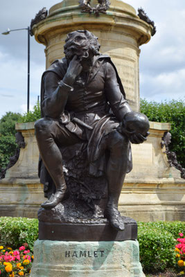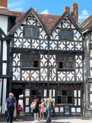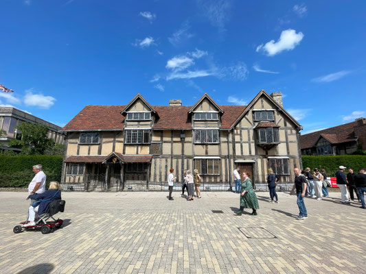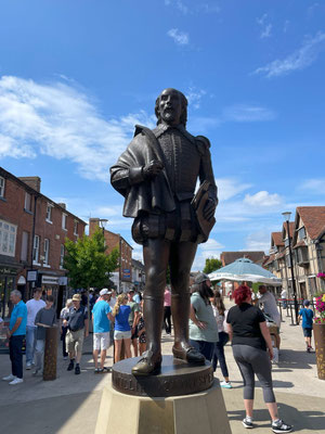 Nachdem wir einen Parkplatz am Stadtrand finden, wollen wir uns ein wenig davon ansehen. Am Ufer des Avon Flusses finden wir einen hübschen Park, wo die berühmtesten Charaktere Shakespeares als bronzene Statuen zum Leben erweckt wurden. Daneben liegen am Ufer des Avon etliche bunte Hausboote, die teilweise zu mieten sind. Manche Besitzer haben ihre Klappstühle aufgebaut und quatschen heiter vorbeispazierende Touristen an, um ihre "floating beauty" anzupreisen. Ines Highlight ist eine umfassende Getränketafel im Inneren eines Kaffeehauses. Ihre Wahl fällt auf eine "Spiced Hot Chocolate", die Spezialität des Hauses, von der sie noch länger schwärmen wird. Danach geht es zwischen schwarz-weißen Fachwerkshäusern hinauf in die Fußgängerzone. Ein Straßenmusiker beschallt eine ganze Ecke mit Coversongs, während er seine Performance live via Smartphone in die Welt streamt. Als er um eine Pause bittet, weil es so ein "bloody hot day" ist, müssen wir lachen. Schon frühmorgens am Campingplatz hat Ines den exakt selben Wortlaut von einer Dame vernommen und mir anschließend kopfschüttelnd darüber berichtet. Wir freuen uns ja auch über die Sonne und die 20 Grad, aber von "bloody hot" sind wir meilenweit entfernt. Mal sehen, wie die kommenden Wochen unser Temperaturempfinden beeinträchtigen werden. Vor dem Shakespeare Museum versammeln sich, wie bereits auch schon in Oxford, viele Reisegruppen aus Fernost. Wir sind mit der Außenansicht des Geburtshauses zufrieden, besuchen noch einige kleine Läden und brechen danach wieder auf.