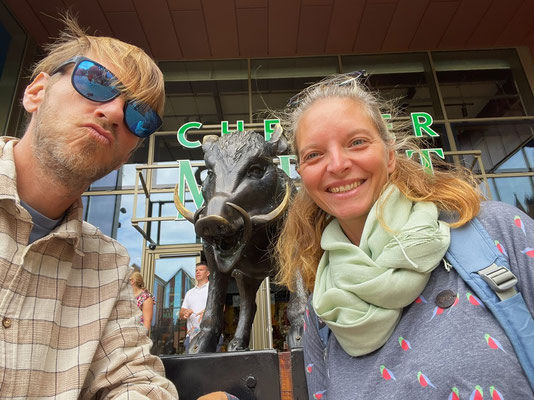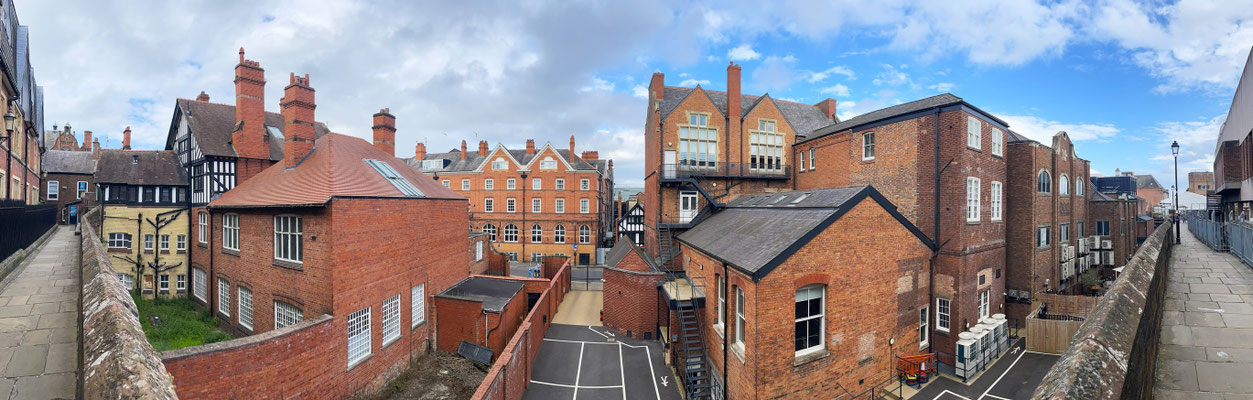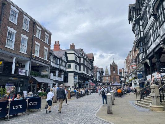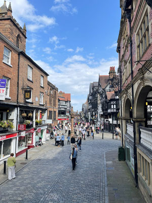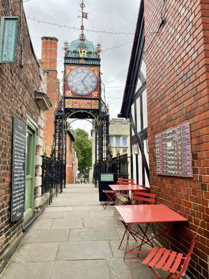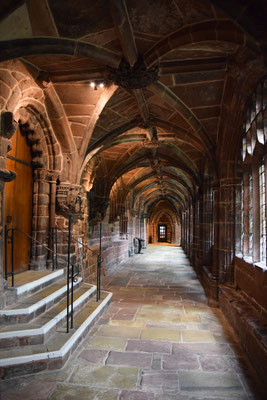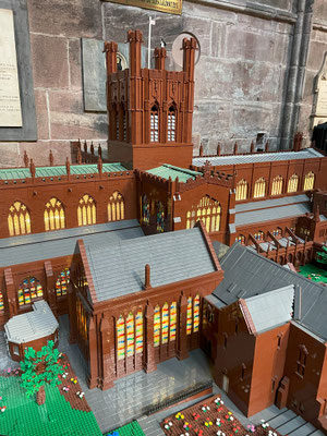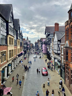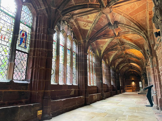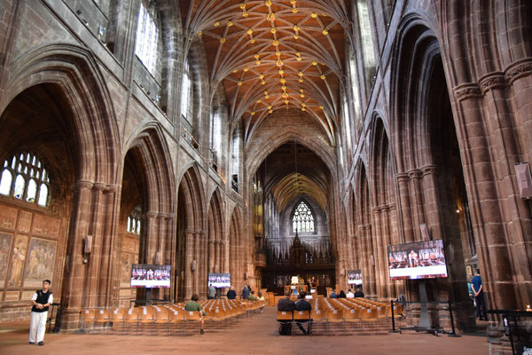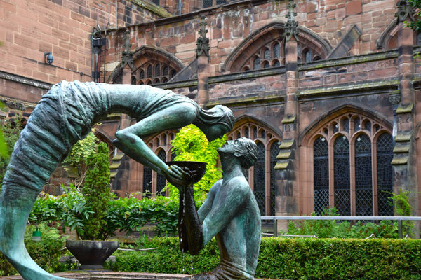Nach einer weiteren kühlen und windigen Nacht in den Hügeln des Peak Districts, zieht es uns am nächsten Tag wieder in eine Stadt. In Chester befinden sich zwei weitere Attraktionen, die von English Heritage verwaltet werden und uns beide interessieren. Einerseits das Chester Castle aus dem 11.Jahrhundert und andererseits das größte römische Amphitheater auf englischen Boden. Die Stadt, die auch von den Römern gegründet wurde, liegt südlich von Liverpool und bereits nahe an der Grenze zu Wales. Es ist Samstag Mittag als wir dort ankommen und direkt unter der Burg einen Bezahlparkplatz finden. Zu unserer Überraschung sind die Pforten der Burg geschlossen und ich erkundige mich bei einem Einweiser, ob wir tatsächlich richtig sind. "The castle is closed today, yesterday as well...don't know, maybe something's wrong with the volunteers" meint er freundlich. Wir stecken die kleine Enttäuschung rasch weg und spazieren in die Fußgängerzone. Dort ist richtig was los. Keine Touristen, dafür viel Einheimische auf Shopping-Tour, Straßenmusiker und zahlreiche kostümierte Poltergruppen sind unterwegs. Der erste Eindruck von Chester ist positiv. Die Fußgängerzone wird auf beiden Seiten von Arkadengängen flankiert, die jeweils im ersten Stock der hübschen Fachwerkshäuser liegen. So kann man auf zwei Ebenen, entlang jeder Straßenseite flanieren und einkehren. Zweiteres machen wir auch und beobachten das muntere Treiben. "Schau mal, die nächste Gruppe" deutet Ines auf eine weitere Horde junger Mädels, die knappst bekleidet samt Schleifen eine Bar belagern. "Darling, it's a bloody hot day" antworte ich schulterzuckend. Ines lacht verlegen. Meine lautstarken Auftritte in der Öffentlichkeit sind ihr wohl ein wenig peinlich geworden. Entlang der unterschiedlichen und bunten Läden, denen wir ein paar Besuche abstatten, führt die Fußgängerzone zum Rathaus, das gegenüber einer prächtigen Kathedrale liegt. Wir biegen zuerst in die andere Richtung und besuchen die alte Markthalle, die uns mehr als modern empfängt. In ihrer Mitte befindet sich ein riesiger Foodcourt, angenehme Musik tönt aus den Lautsprechern und die Besucher scheinen allesamt gut aufgelegt zu sein. Wenn wir nicht bereits gegessen hätten, hätten wir zwei "Haglichen" hier unsere Freude. Jede Menge Leckereien aus aller Herren Länder werden vor den Augen der Gäste frisch zubereitet, dabei auch sehr viel Vegetarisches. Beim Hinausgehen entdecken wir noch das Maskottchen des Marktes, ein bronzenes Wildschwein. Ich gebe mir Mühe, mit seiner wilden Frisur mitzuhalten, während wir ein gemeinsames Foto knipsen. Zurück vor dem Rathaus schauen wir einem tanzenden Gorilla dabei zu, wie er zu Bob Marleys "Jammin" für ein bisschen Trinkgeld die Hüften schwingt und besuchen anschließend die Kathedrale. Von außen fügt sie sich mit ihren roten Backsteinen bereits bestens ins Stadtbild ein und kommt ohne einen großen Vorplatz aus. Drinnen haut es uns fast aus den Socken. Nicht nur die Größe ist beeindruckend, sondern vor allem die Akustik. Während wir das zentrale Schiff an einer Ecke des Kreuzgangs betreten, wirkt der fremde mystische Klang wie ein Magnet. Tatsächlich finden gerade Chorproben statt, denen man beiwohnen darf. Wer sich nicht vorne einreihen möchte, kann sogar via Fernseher aus den hinteren Reihen dem Dirigenten auf die Finger sehen. Das Besondere ist, dass es sich nicht um Kirchengesang handelt, wie man ihn erwarten könnte, sondern alte Hymnen und Lieder angestimmt werden, die den gewaltigen Raum füllen und (spätestens als die Orgel einsetzt) mit dem ganzen Körper spürbar sind. Wie angewurzelt bleiben wir sitzen, teils mit geschlossenen Augen. Als Fans von "Herr der Ringe" oder "Game of Thrones", könnte jedes Lied, das so alt und fremd klingt, den jeweiligen Soundtrack bereichern. Wie wir erfahren, handelt es sich auch nicht um einen "Kirchenchor", sondern um einen Chor, der hier regelmäßig auftritt und probt. Nächstes Monat steht ein Auftritt an, wo ausschließlich Interpretationen von Liedern der Band "Radiohead" gesungen werden. Als der Chor pausiert, schwärmen Ines und ich aus und erkunden verschiedene Ecken und Gänge. Ines präsentiert mir anschließend stolz den präzisen Nachbau der Kathedrale, den ein Künstler mit Legosteinen erschaffen hat. Ich zeige ihr das goldene Freimaurersymbol, das ich auf einer Ehrentafel entdeckt habe. Danach geht es in den Kreuzgang, dessen 365 Fenster jeden Tag des Jahres samt seinen jeweiligen Heiligen abbilden. Die prächtigsten Fenster gehören den Erzengeln und den Evangelisten, die mit besonders viel Detail verarbeitet wurden. Im Innenhof wartet ein blumengeschmückter Garten samt mehreren Sitzbänken auf Besucher. Der Blickfang ist der große Brunnen, aus dessen Mitte sich eine moderne Skulptur erhebt, die Jesus mit der Frau am Jakobsbrunnen darstellt.