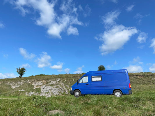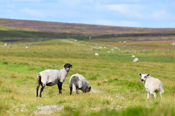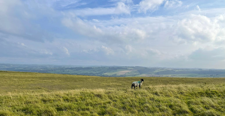 Unser Nachtlager finden wir eine halbe Stunde nördlich auf einem höher gelegenen Wanderparkplatz. Von dort haben wir einen hübschen Ausblick auf die Region und den Nationalpark, der uns umgibt. Schafe und Kühe verleihen den grünen Hügeln schwarze und weiße Farbtupfer. Hohe Berge gibt es trotz des klingenden Namens im Peak District nicht, dafür Englands höchst gelegenes Dorf mit 463m. Die Nacht ist windig und nass, wie auch der kommende Morgen. Ines Husten ist noch keinen Deut besser und wir entscheiden uns, einen Ruhetag einzulegen. Ein heftiger Wackler im Bus sorgt während des Frühstücks für kurze Aufregung und anschließende Heiterkeit. Ein neugieriges Schaf hat sich ein wenig an unserem Bus gerieben und zieht flott weiter, als wir die Kamera zücken. Am späten Nachmittag nutzen wir eine Regenpause, drehen den Spieß um und besuchen die Schafherde nebenan. Unsere überfällige Dusche nehmen wir anschließend, wie gehabt, draußen und sehnen uns mehr den je nach ein bisschen Sommer und ein paar Grad mehr.