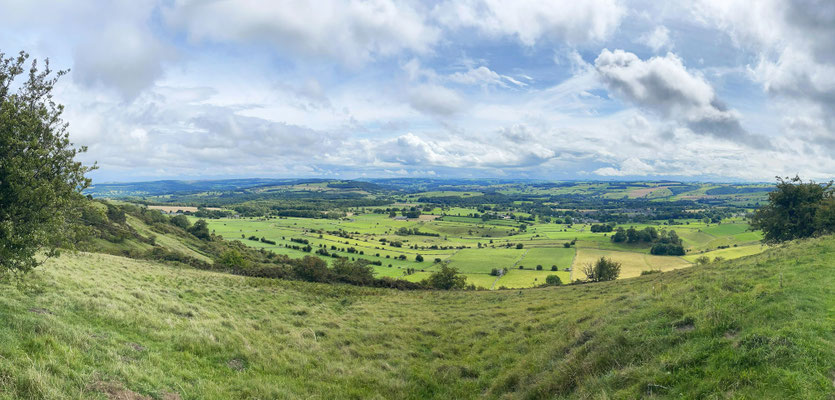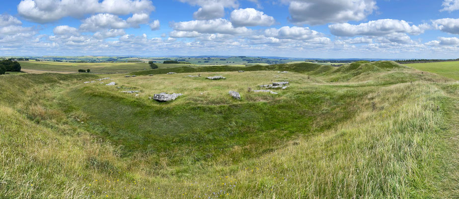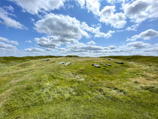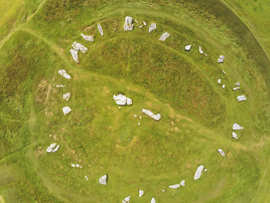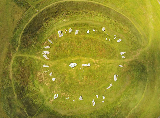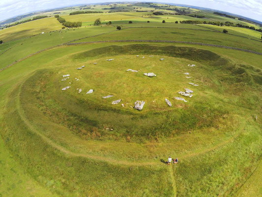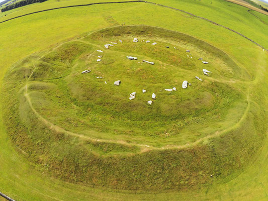 Am nächsten Morgen besuchen wir im Peak District einen weiteren Ort, den wir durch English Heritage entdeckt haben. Der "Arbor Low" Steinkreis, der vor über 4500 Jahren errichtet wurde, soll von einem 90 Meter breiten Erdwall umgeben sein und zu den schönsten Kultstätten Englands zählen. Exakt 40 tonnenschwere Monolithen sind hier aufrecht errichtet worden, die allesamt noch vorhanden sind. Die Strecke dorthin wirkt wie eine Spazierfahrt durchs "Auenland". Kleine Bäche, noch mehr Schafe und weithin saftige Wiesen. Hobbits begegnen wir nicht, obwohl unser Ziel neuerlich die Fantasie anregt. Zu Fuß marschieren wir den letzten Kilometer durch Weideland und glauben zuerst, vor dem Hügelgrab zu stehen, dass ebenso am Gelände zu finden ist. Tatsächlich stehen wir vor dem meterhohen Erdwall, der die massiven Kalksteine fast solange verdeckt, bis wir vor ihnen stehen. Die Monolithen haben, nach tausenden von Jahren, ihre aufrechte Haltung gegen eine "gemütlichere" eingetauscht und liegen kreisrund um uns verstreut. Als wir durch den zentralen Korridor inmitten der Steine wandern, stechen uns die beiden größten Exemplare ins Auge. Genau wie in Stonehenge und anderen Kultstätten wurde auch Arbor Low nach den Gestirnen ausgerichtet. Die beiden großen Monolithe in der Mitte dienten demnach als verlässlicher Kalender, um sowohl die Sommer-, als auch Wintersonnenwende festzustellen. Wir verharren genau dort und versuchen uns vorzustellen, wie die Zeremonien hier vor tausenden Jahren abgelaufen sind und wer die Menschen waren, die daran teilgenommen haben. Den restlichen Steinen schenken wir danach unsere Aufmerksamkeit und gehen eine volle Runde entlang des Erdwalls. Dabei muss ich feststellen, dass es kaum möglich ist, mit der Kamera den Ort in seiner Gesamtheit abzulichten. Ein Fall für die Drohne also. Von oben betrachtet, erschließt sich ein viel deutlicheres Bild der Steine und ihrer kreisrunden Anordnung. Ich freue mich sehr über die Videos und Fotos und schicke Johannes, der uns in Spanien seine alte Drohne vermacht hat, im Geiste ein großes Dankeschön. Am Nachmittag führt uns der "Auenland-Motorway" weiter in den Westen. Auf einer Farm, die Camping anbietet, versuchen wir ohne Reservierung unser Glück. Die freundliche Farmerin wirkt ein wenig zerstreut und schusselig. Als sie uns den Weg zur Wiese zeigt, merkt sie lachend an, dass sie heute schon mittags ein Bier getrunken hat. Wir richten uns in der hintersten Ecke neben dem Weidezaun ein und freuen uns über die ruhige Gesellschaft von Pferden und Kühen.