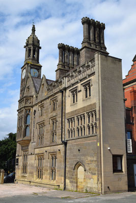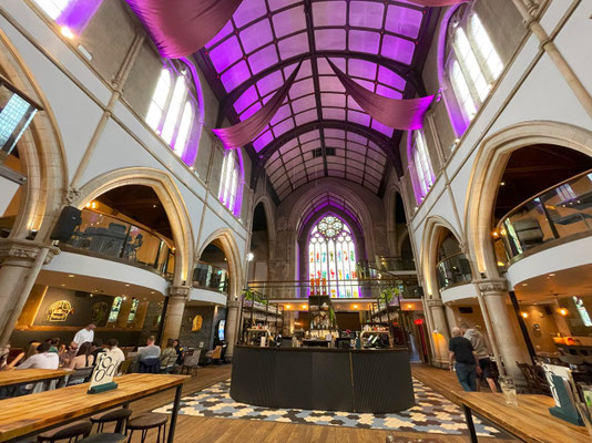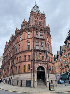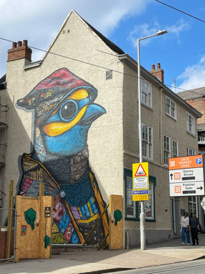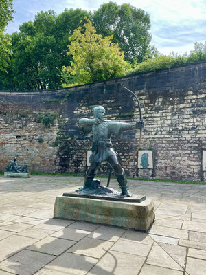 Als wir am nächsten Tag mit dem öffentlichen Bus ins Stadtzentrum fahren, kehren nicht nur die Wolken, sondern auch der Regen zurück. Wir sind zumindest vorbereitet und bleiben trocken. Petra und Alex haben das Stadtzentrum als "nicht so besonders" beschrieben und uns 2-3 Orte genannt, die jedoch sehenswert sind. Auch unser erster Eindruck der Innenstadt ist überschaubar. Während wir dem Regen in einer weiteren Filiale der Buchhandlung Waterstone entkommen, fragen wir uns, ob sich der Eisverkäufer in seinem Foodtruck nebenan tatsächlich Geschäft erhofft. Die Filiale ist abermals riesig und ein Highlight. Das Sortiment und die verschiedenen Themenbereich übertreffen die, des heimischen Pendants um ein zig-faches. Als wir eine halbe Stunde später den Laden verlassen, hat der Regen abgenommen und der Eisverkäufer prompt wieder Kundschaften gefunden. Unser Spaziergang führt uns quer durch die Innenstadt und endet vorerst bei einem besonderen Lokal. Das "Pitcher & Piano" ist Pub, Bar und Club gleichzeitig, wobei die Besonderheit die Location an sich ist. Das Lokal befindet sich ein einer ehemaligen Kirche, die sehr gelungen umfunktioniert wurde. Dort gönnen wir uns zwei Getränke und genießen das besondere Ambiente. Uns gefällt es ausgesprochen gut und wir können einen Besuch nur weiterempfehlen. Ines hat wenig später einen seltenen Anfall spontaner Neugier und stürmt (!) in eine andere Kirche. Vor einem Gotteshaus hängen Transparente und Plakate, einer uns bisher unbekannten Glaubensgemeinschaft. Die Schriftzüge versprechen Erlösung und werben mit kostenloser Bekehrung. Ein wenig suspekt also. Von drinnen tönt jedoch heitere Gospelmusik nach draußen und Ines marschiert ungebremst in die Veranstaltung. Ich mache gerade noch ein Foto, als ich ihren Ansturm bemerke und folge ihr rasch nach. Entgegen meiner Sorgen, ist sie einer Bekehrung entgangen und drinnen vor einer verschlossen Türe hängengeblieben. "Die haben ja auch Kaffee und Kuchen zur Bekehrung versprochen" meint sie lächelnd, als sie meinen überraschten Gesichtsausdruck bemerkt. Danach spazieren wir ein Stück weit den "Robin Hood Trail" entlang. Dem Sagenheld, der hier und vor allem im nahen Sherwood Forest zuhause gewesen sein soll, sind in Nottingham mehrere Denkmäler gewidmet. Ob der Urtyp des "edlen Räubers" tatsächlich gelebt hat ist umstritten. Hier in Nottingham lebt die Legende von Robin Hood jedoch unentwegt. Uns ist es ohnehin egal, ob es sich um einen historischen Charakter handelt oder nicht. Aufgewachsen mit den Büchern und Filmen, hat der Vorkämpfer für soziale Gerechtigkeit sowieso unsere Sympathien. Die lebensgroße Statue wird umzingelt von Touristen aus Asien, die wir gleich als Fotografen einstellen um uns mit dem Bogenschützen abzulichten.