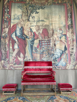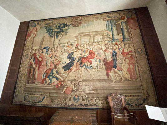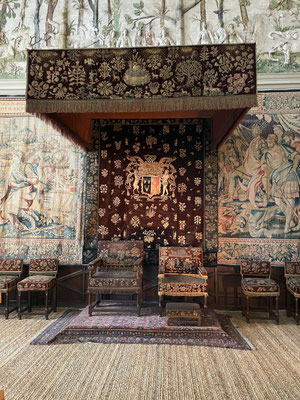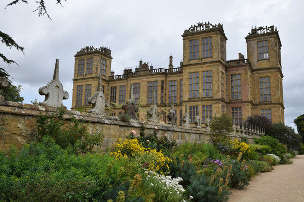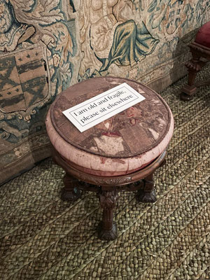 Dort ist wesentlich mehr los, was sich uns erst erschließt, als wir den Prachtbau aus dem 16. Jahrhundert betreten. Es handelt sich um den Sitz der "Bess of Hardwick", der Gräfin von Shrewsbury, die im 16. Jahrhundert neben der Königin Elizabeth I. die reichste Frau des Landes war. Was sie mit dem Reichtum angestellt hat, dürfen wir nun genauer unter die Lupe nehmen. "Nau servas, die san oba riesig" deute ich auf die riesigen Wandteppiche, die in der Galerie hinter dem großen Rittersaal hängen. Die Motive handeln nicht vom englischen Adel oder dessen Landleben, sondern bilden Szenen aus der griechischen und römischen Mythologie ab. Die Kunstwerke haben aufgrund ihrer hohen Qualität (und geschickten Restauratoren) bis heute nicht an Strahlkraft verloren. Die größten Exemplare des Hauses, die Gideon Wandteppiche, sind über 6 Meter hoch und insgesamt 70 Meter (!) lang. Sie hängen, nach 24-jähriger Restaurierung, lichtgeschützt im obersten Stockwerk. Wir finden die Dinger auch im halbdunklen ziemlich beeindruckend. So auch den Empfangsaal, die prächtigen Möbelstücke, die so viele Jahre auf dem Buckel haben. Der Humor der Engländer ist übrigens auch hier allgegenwärtig. Während in Österreich oder Deutschland nüchterne Verbotsschilder wie "Nicht berühren" oder "Zutritt verboten" sichtbar wären, platzieren die Engländer kleine Schilder wie "I am old and fragile, please sit elsewhere" auf einem unleistbar wertvollen Sitzmöbel der Ausstellung. Was hier auch besonders ist, sind die meist pensionierten Volunteers (also freiwillige Guides), die in fast jedem Saal dezent auf wissbegierige Besucher warten, mit denen sie ihr Wissen teilen können. Uns gefällt die Hardwick Hall ausgesprochen gut. Vielleicht auch, weil meine Erwartung an ein "elisabethianisches Landhaus" samt Prachtgarten eher überschaubar war. Ines darf als Bonus noch ein wenig in diesem Prachtgarten stöbern und entwendet dabei (natürlich völlig legal) ein paar Blätter Salbei und Thymian zum Naschen gegen ihren Husten.