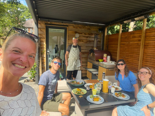 Für den kommenden Tag hat Alex angekündigt, den Pizzaofen einzuheizen. Unsere Vorfreude wird von einem strahlend blauen Himmel zusätzlich genährt. Tatsächlich hat die Sonne vor, ein wenig länger zu bleiben und erstmals seit zwei Wochen können wir wieder mit kurzen Hosen und T-Shirts im Freien sitzen. Unsere Gastgeber haben zum Essen noch eine weitere Freundin eingeladen, die die Runde bereichert. Chefbäcker Alex leistet einen hervorragenden Job und liefert im Minutentakt verschiedene Variationen meiner Leibspeise. What a beautiful day!