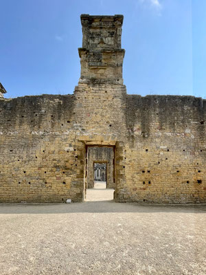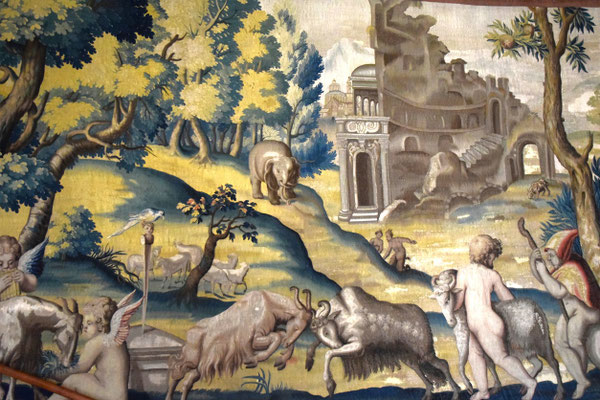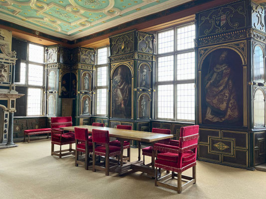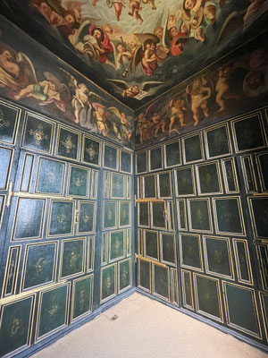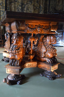 Die Ruinen der ursprünglichen Anlage aus dem Mittelalter verlangen einem etwas Fantasie ab. Von "Paradieszimmer" und der Empfangshalle ist nur mehr bröckeliges Mauerwerk übrig. Die Abbildungen auf den Infotafeln schaffen ein wenig Abhilfe. Der "neuere" Zubau, den die Herren der Familie Cavendish (Sohn und Enkel der Bess of Hardwick, die wir am Vortag kennenlernen durften) in Auftrag gegeben haben ist hingegen in ausgezeichnetem Zustand. Das "Little Castle" wird von einer ringförmigen Mauer umgeben, die zu einer Rasenfläche führt, die den "Venusbrunnen" umfasst. In verschiedenen Einlässen in der Mauer finden sich Kamine und Bänke anstatt, wie von einer Burg zu erwarten, Wehranlagen. Der Grund liegt in der Verwendung des Ortes. Bolsover Castle diente der Familie Cavendish als Erholungs- und Vergnügungsresidenz, wo sie Gäste empfangen haben oder einfach gute Unterhaltung genießen wollten. Im Inneren der Burg sind die Spuren des Wohlstands weithin gut erhalten. Wir entdecken das "Sternenzimmer", wo Wände und Decken aufwendig mit dem Nachthimmel geschmückt und bemalt sind, sowie verschiedene Lesekammern, deren meisterhafte Deckenmalerei römische und griechische Mythen abbildet. Inmitten der Vergnügungszimmer finden sich Spieltische und alte mechanische Apparaturen, an denen man sich versuchen konnte. Die Voräufer moderner Spielhallen oder Hobbyräume. Jeder Raum im Bolsover Castle sollte nicht nur imponieren, sondern auch inspirieren und Freude stiften.