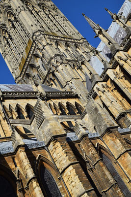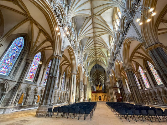 Als der Steep Hill sich kurz zu beiden Seiten öffnet, haben wir die Kathedrale auch schon erreicht. Durch ein altes Stadttor gelangen wir zum großen Platz, wo sich die beindruckende Kirche erhebt. Der aktuell 83 Meter hohe Bau aus dem 11. Jahrhundert war, nach seiner Restaurierung im 14. Jahrhundert, fast doppelt so hoch und für rund 200 Jahre lang, das höchste Gebäude der Welt! Diesen Titel hat sie der Cheops Pyramide in Ägypten abgelaufen, die bekannterweise mindestens 3800 Jahre lang den ersten Rang eingenommen hat. Die Kathedrale gilt als Musterbeispiel englischer Gotik und gilt mit seinen Details als eine der schönsten Gotteshäuser Europas. Vor wenigen Tagen haben wir nichts davon gewusst und nun stehen wir bereits drinnen. Kunsthistoriker hätten ihre Freude an den Säulen, Kapitellen und Fenstern. Nach einem Rundgang zieht es uns weiter zum Lincoln Castle, wo eines von vier verbliebenen Exemplaren der Magna Carta aufbewahrt wird. Das Dokument aus dem frühen 13. Jahrhundert gilt als Grundpfeiler der englischen Verfassung und hielt unter anderem erstmals fest, dass auch der König nicht über dem Gesetz steht.